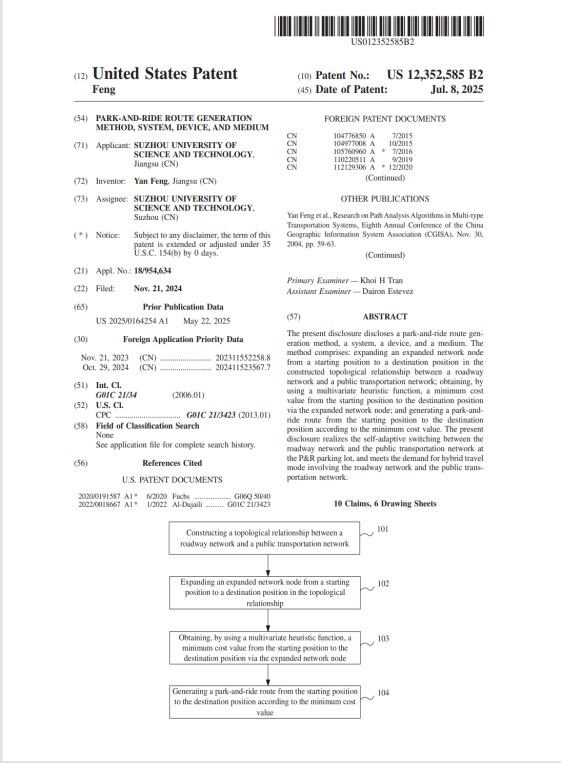 近日,我校地理科学与测绘工程学院研究团队申请的国际发明专利“PARK-AND-RIDE ROUTE GENERATION METHOD, SYSTEM, DEVICE, AND MEDIUM”(停车换乘路线的生成方法、系统、设备及介质)喜获美国发明专利授权(授权号:US 12352585B2)。此次获批授权是对我校测绘地理信息科学与智能交通交叉创新能力的权威认可,该成果将对我校测绘、地理信息和遥感科学与技术硕士点申报提供重要支撑,同时在自主知识产权国际化方面取得了新成效。