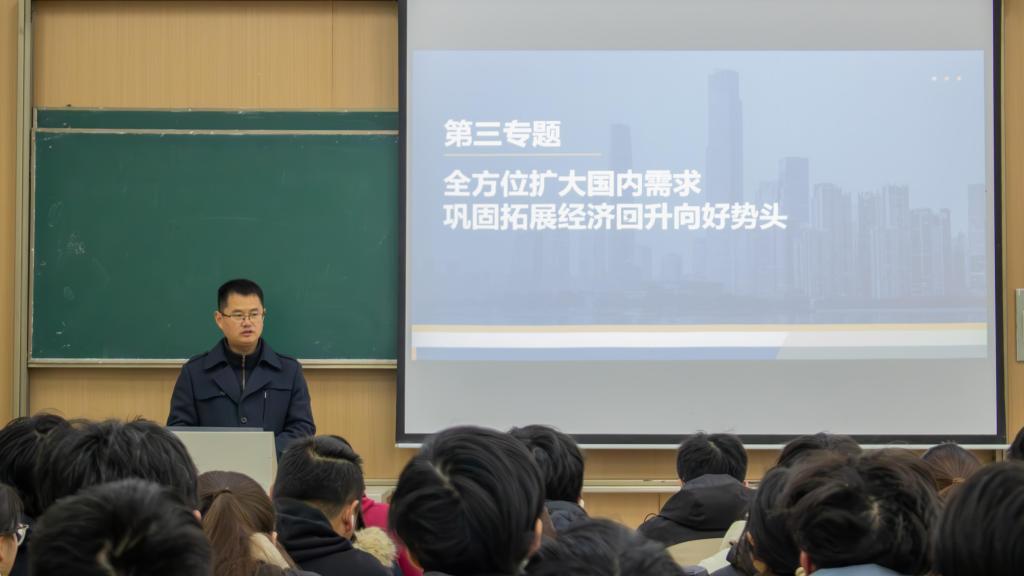 院长王永志以《全方位扩大国内需求巩固拓展经济回升向好势头》为主题,聚焦当前经济发展的核心议题,为学生们深入解读了扩大国内需求的战略意义、重点任务和实践路径。授课中,他结合当前经济发展态势,深入浅出地分析了国内需求在经济发展中的基础性作用,详细阐释了全方位扩大国内需求的政策举措和具体部署。他指出,扩大国内需求是应对当前复杂经济形势、推动经济高质量发展的关键抓手,既关系到经济回升向好势头的巩固拓展,也与每个人的生活和发展息息相关。同时,他鼓励同学们要主动关注经济社会发展大局,学会用专业视角分析经济现象,将专业学习与国家发展需求紧密结合,努力成长为适应国家发展需要的高素质人才,为推动经济社会持续健康发展贡献智慧和力量。
